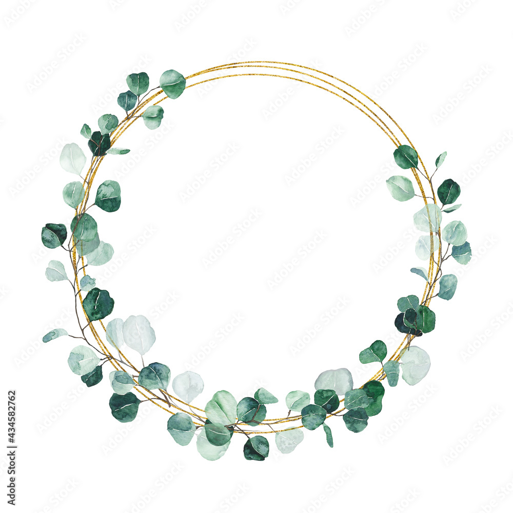 Fototapeta Watercolor eucalyptus gold wreath with green leaves isolated on white background