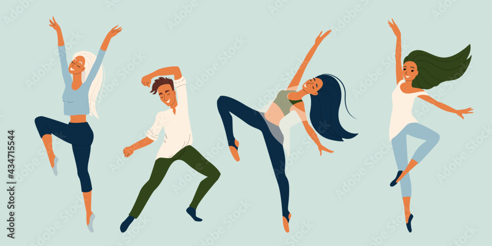 Fototapeta Girl and guy dancers in different poses, set of vector characters in flat style, collection of modern dancers