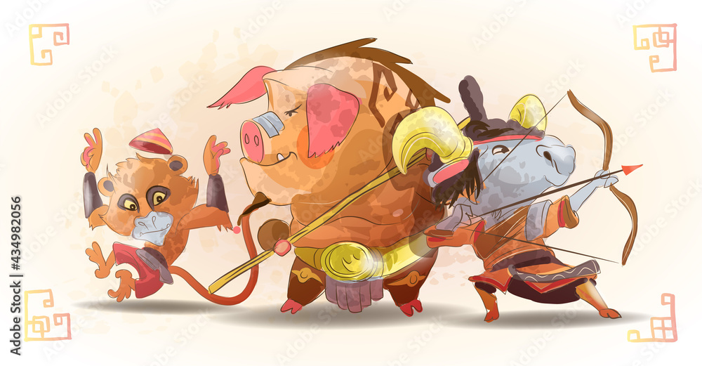 Fototapeta Chinese zodiac animals cartoon characters of monkey pig goat isolated cartoon ha