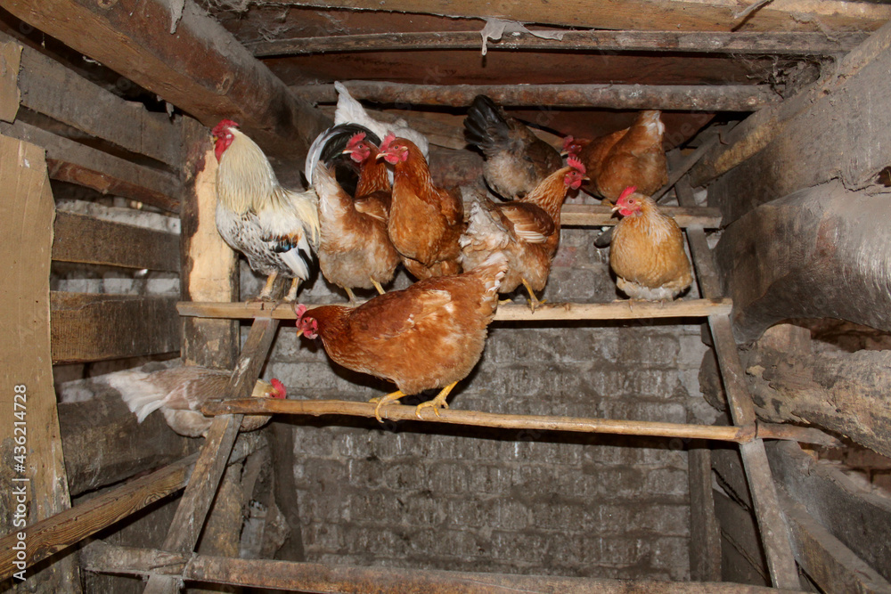 Fototapeta wooden village chicken coop with roosts for hens and roosters