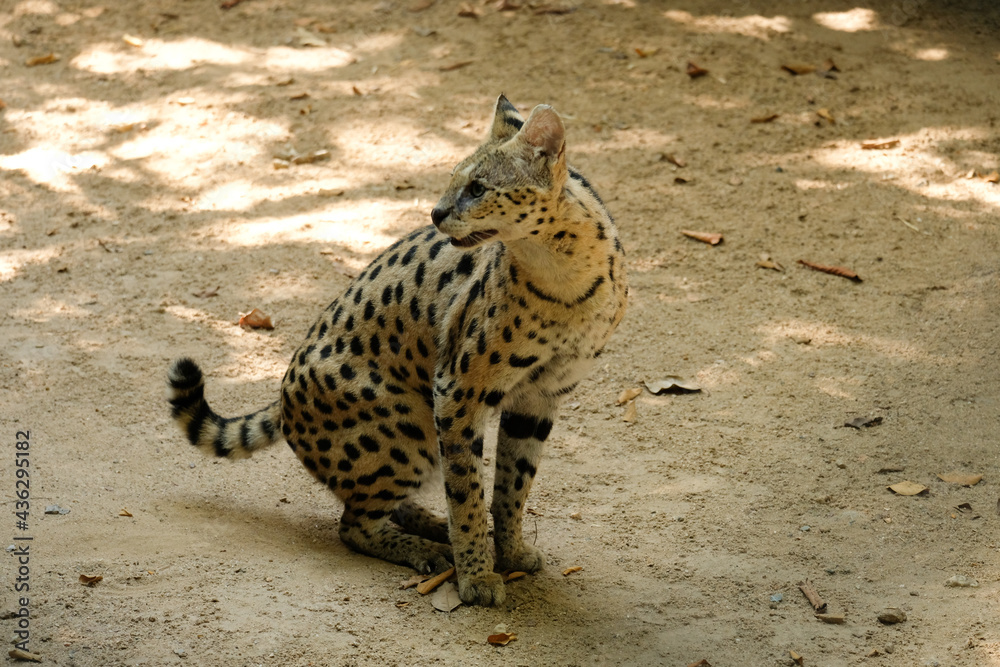 Fototapeta Servals are medium-sized wild cats with tawny, black-spotted coats and long necks and long legs that allow them to see over savanna grasses