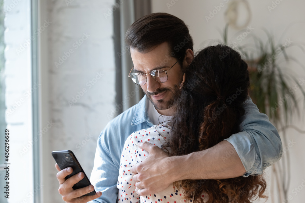 Fototapeta Dishonest young man cuddling loving woman, using smartphone behind back, checking her calls or communicating with mistress