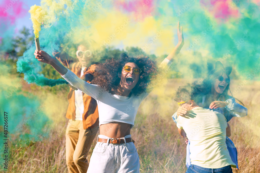 Fototapeta Beautiful young man and woman hold light up colored smoke bombs - Happy friends having fun in the park with multicolored smoke bombs - Young students celebrating spring break together