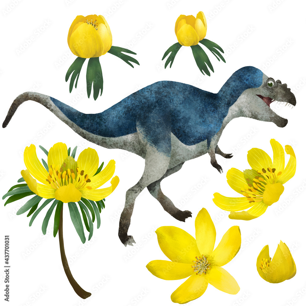 Fototapeta Cute dinosaur (gorgosaurus) on rainforest background, funny reptile in forest, jungle, childish clipart set with bright yellow lily flowers, cartoon isolated illustration