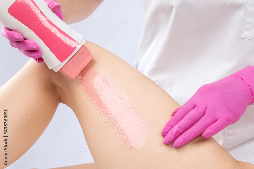 Fototapeta A beautician makes a depilation of a woman's legs in a beauty salon