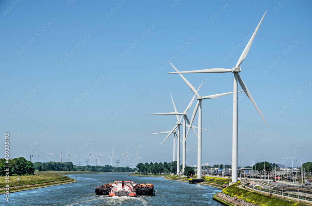 Fototapeta Rotterdam, The Netherlands, June 12, 2021: cargo vessel on Hartel canal, lined w