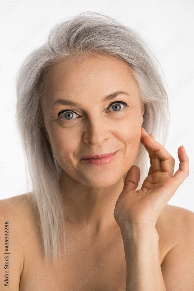 Fototapeta Woman with grey hair holding hands near her face and smiling