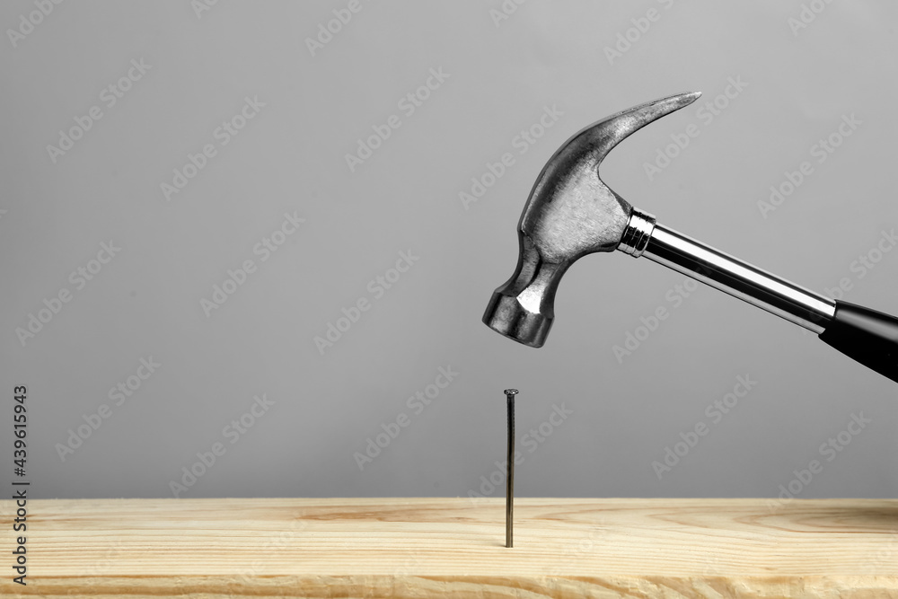 Fototapeta Hammering nail into wooden surface against grey background, space for text