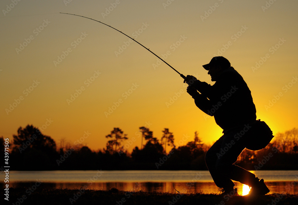 Fototapeta Pêcheur combattant un poisson au soleil couchant