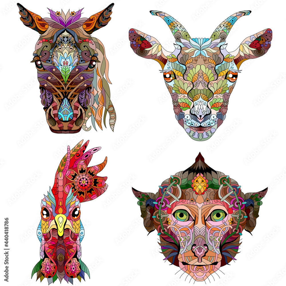 Fototapeta Zentangle horse, goat, rooster and monkey heads