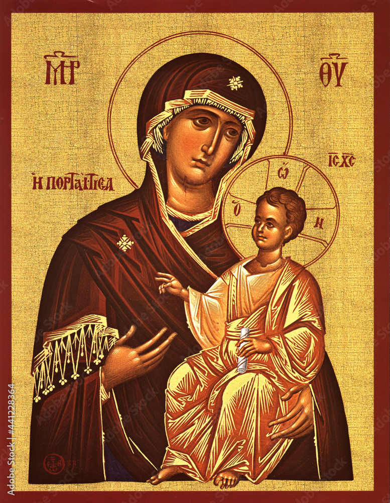 Fototapeta Icon of Madonna Mother of God (Mary) and child (Jesus Christ) on mahogany and gold, from Romanian Monastery, Neamt county