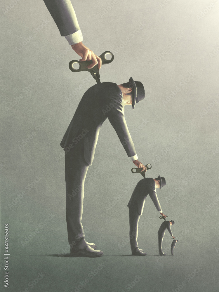Fototapeta illustration of windup key men manipulation, abstract surreal concept
