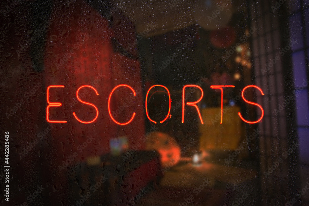 Fototapeta Vintage Neon Sign in Wet Rainy Window Escorts