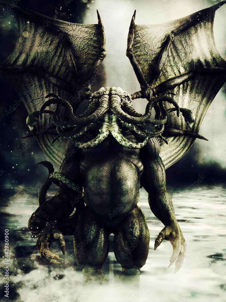 Fototapeta Winged monster with tentacles on his face emerging from a lake at night