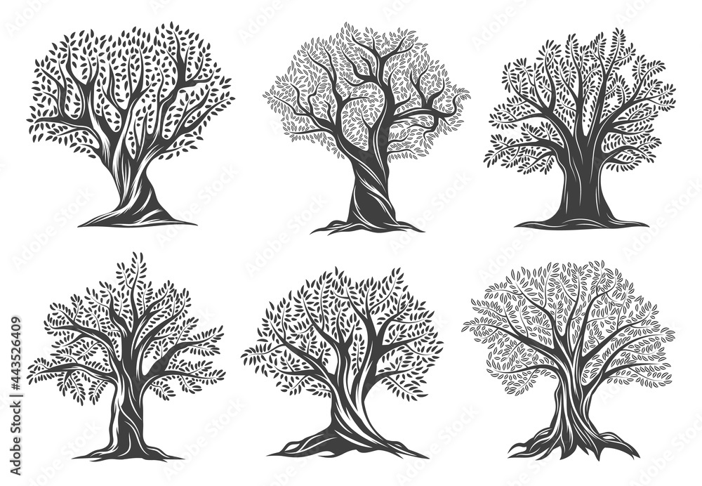 Fototapeta Old olive trees with leaves, cracks in bark and brunches on twisted trunk