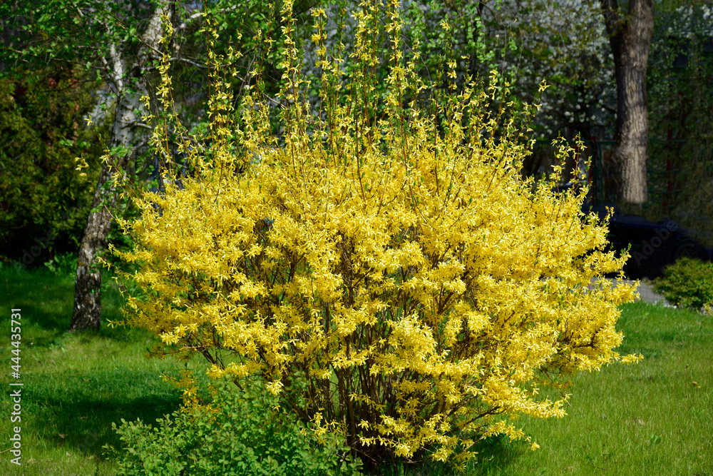 Fototapeta Forsythia flowers in front of with green grass and dark green bushes