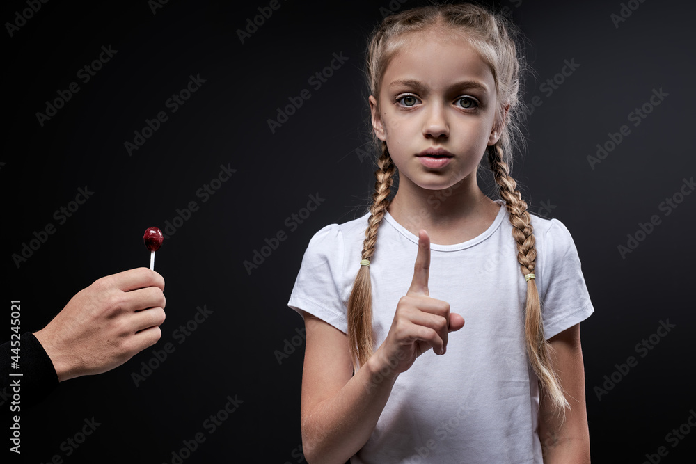 Fototapeta Caucasian child girl say no to pedophile, encourages children to refuse the offer of maniac