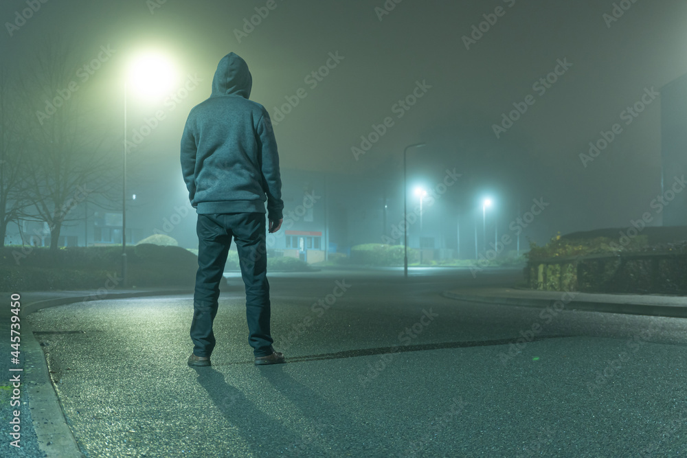 Fototapeta A mysterious hooded figure with back to camera, standing on a road in a light industrial urban area