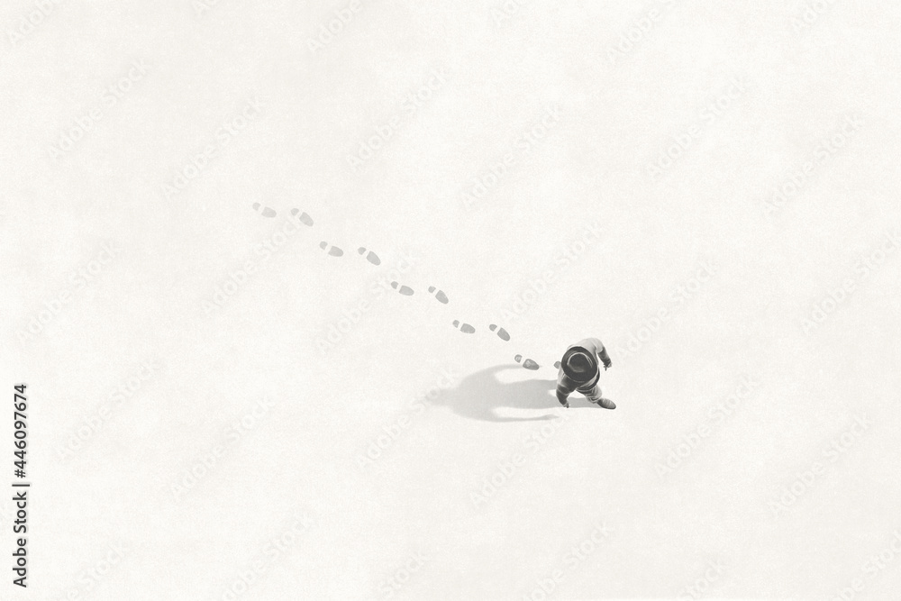 Fototapeta Illustration of man walking in the streets leaving footsteps on the ground, past