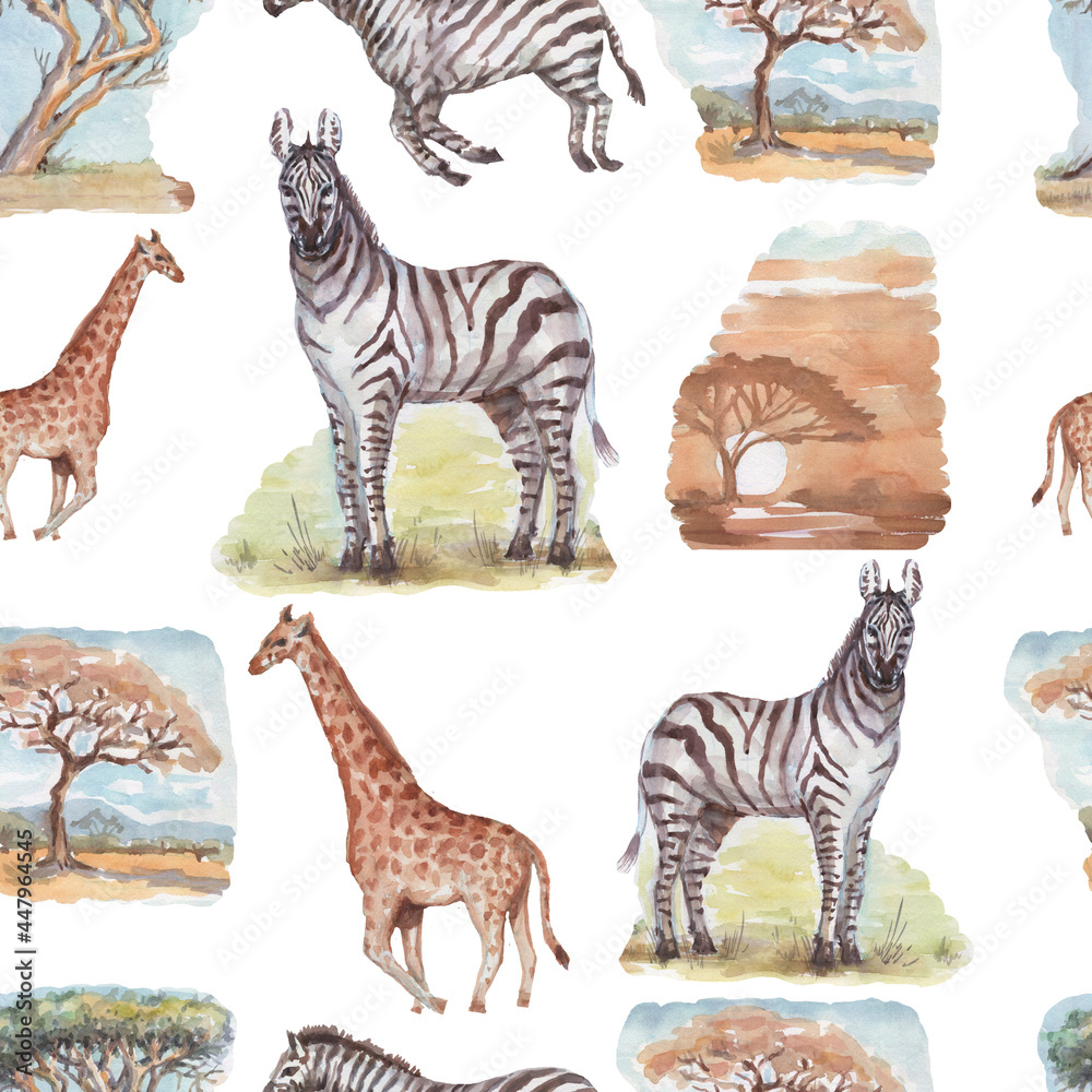 Fototapeta savannah africa zebra giraffe safari animals watercolor hand drawn illustration