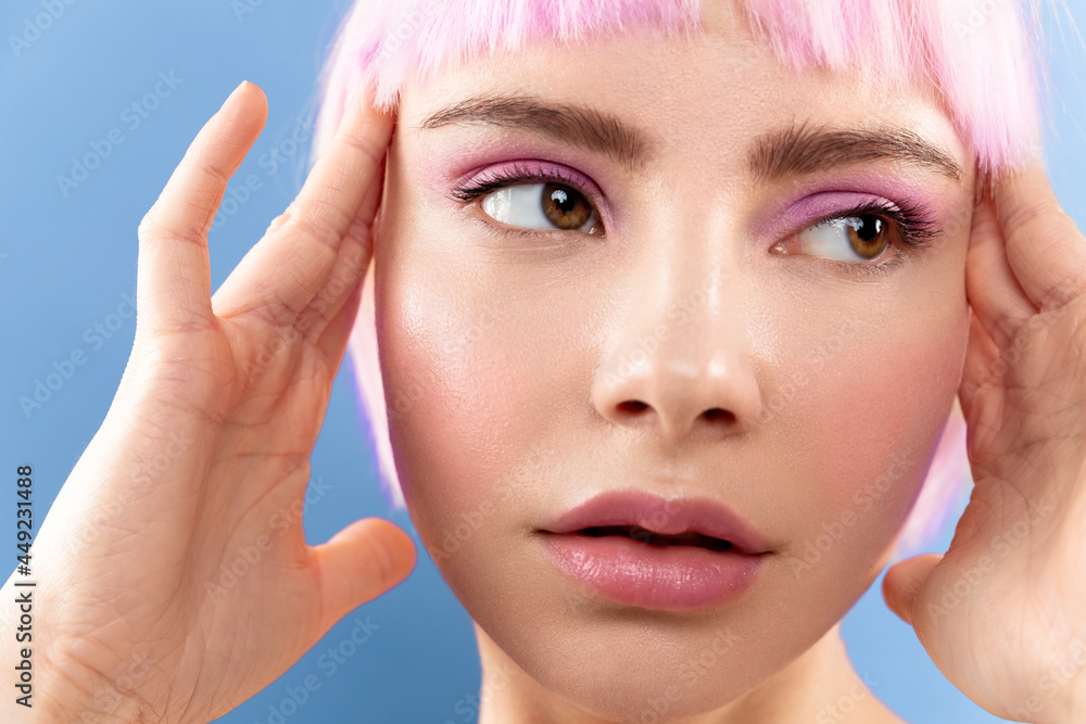 Fototapeta Closeup of beautiful young lady with natural make up, plump parted lips, tempting appearance, perfect eyebrows, ideal face skin
