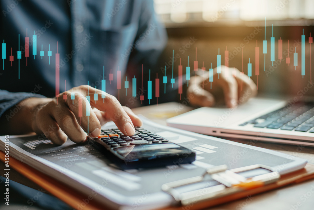 Fototapeta Male working on desk office with using a calculator to calculate share