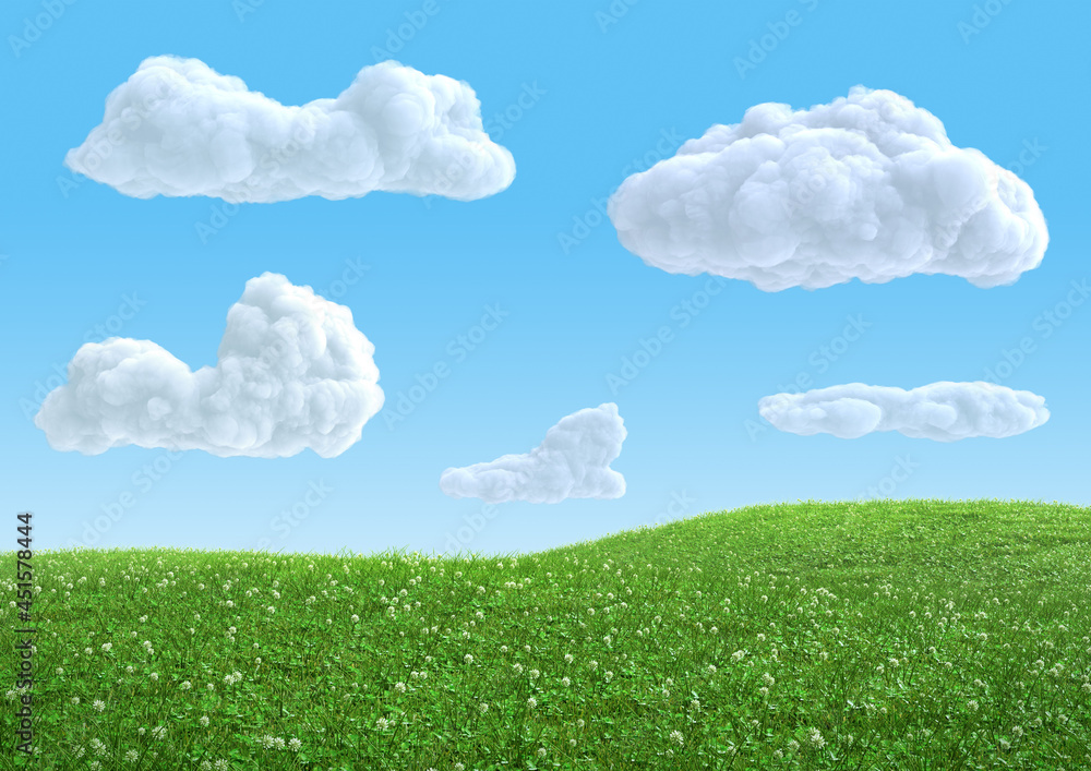 Fototapeta Realistic green grass hills on blue sky with clouds