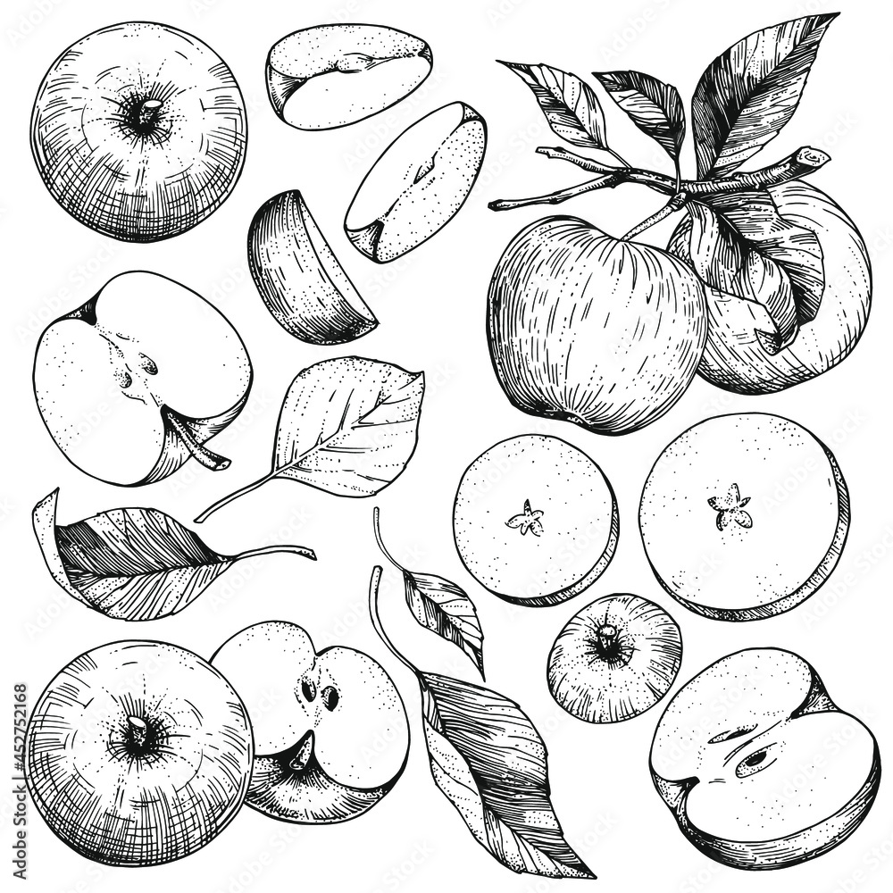 Fototapeta A set of hand-drawn sketches with apples and leaves