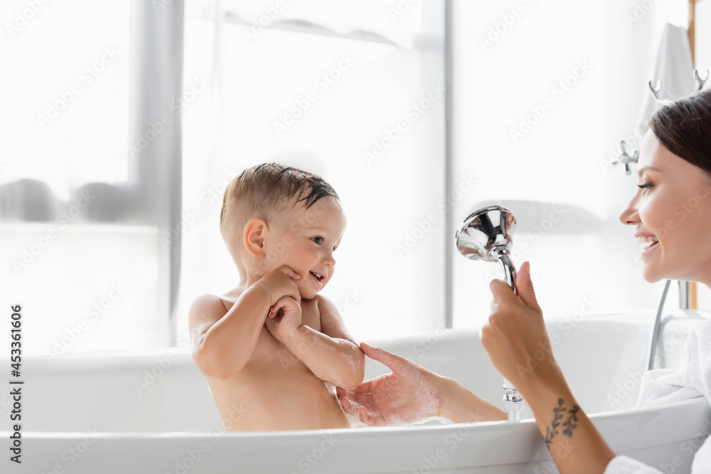 Fototapeta cheerful mother with tattoo holding shower head while bathing toddler boy in bat