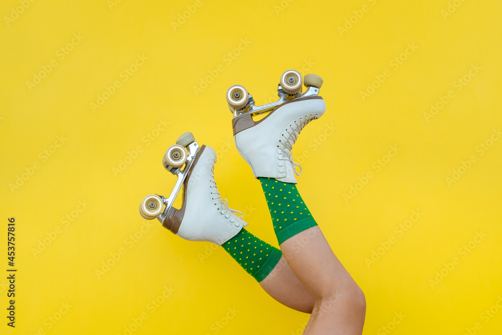 Fototapeta Young woman legs with vintage quad roller skates on yellow background