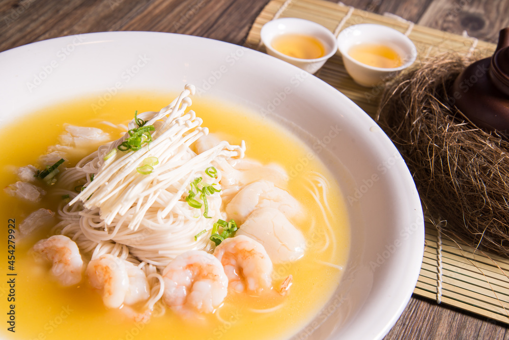 Fototapeta braised thin noodle with seafood prawn in yellow chicken cheese stock sauce on w