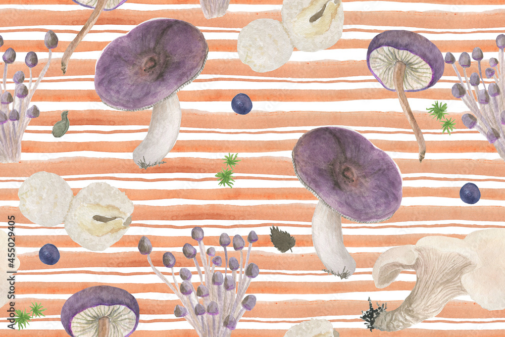 Fototapeta Watercolor painting seamless pattern with violet mushrooms on stripes background