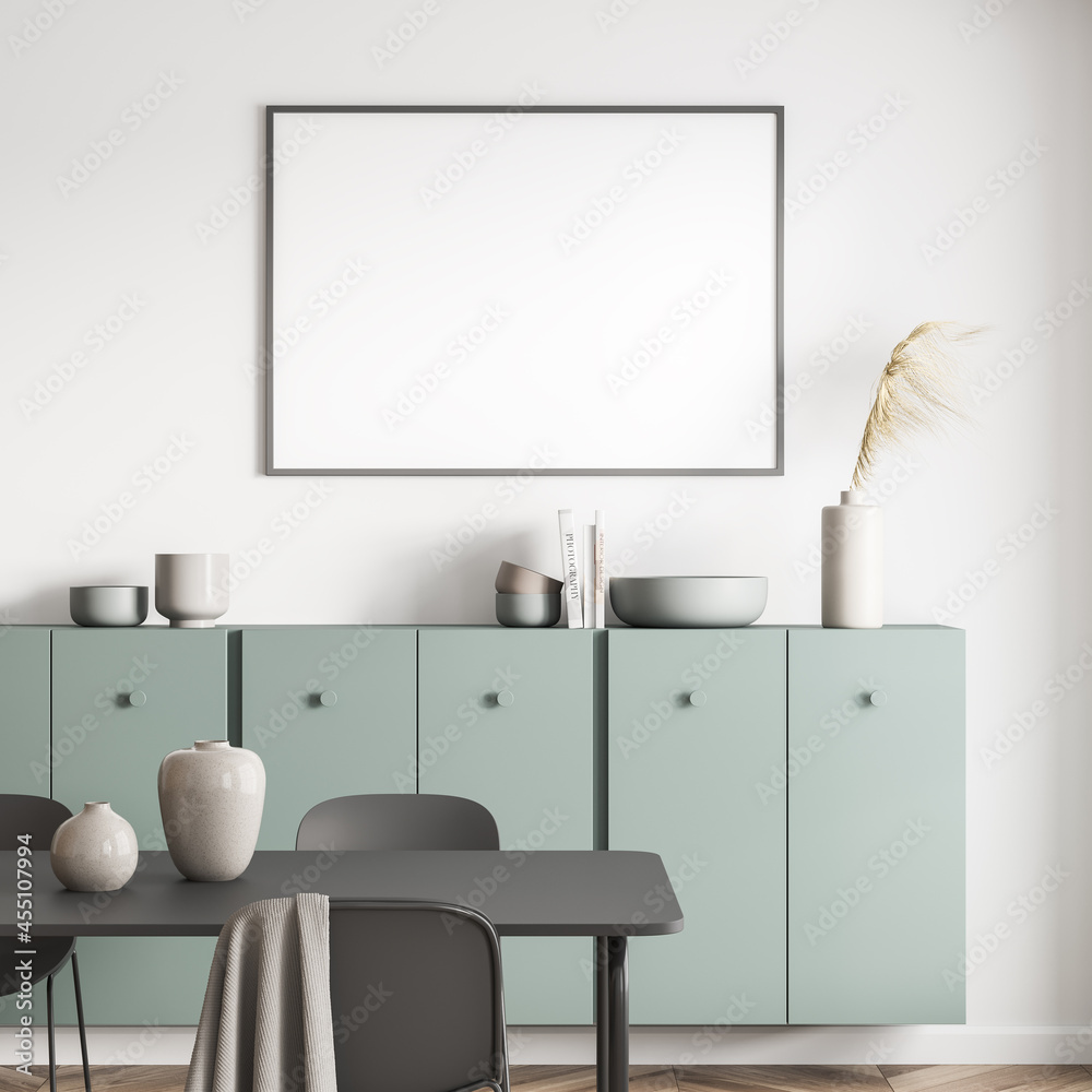 Fototapeta Living room with black framed poster above green sideboard and table