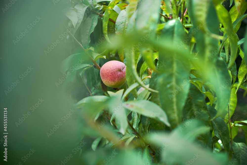Fototapeta red peach ripening on tree ready for harvest, surrounded by green leaves