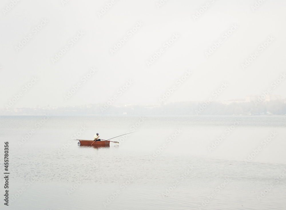 Fototapeta A lonely fisherman rows in a boat in the lake