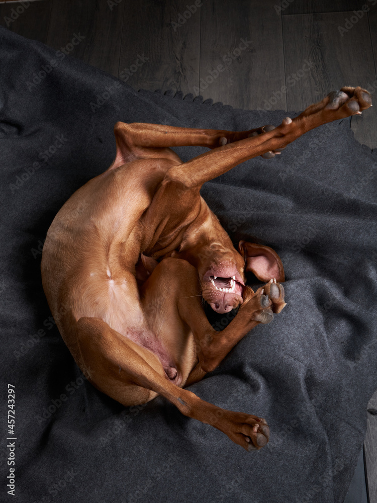 Fototapeta A funny dog is resting on a blanket