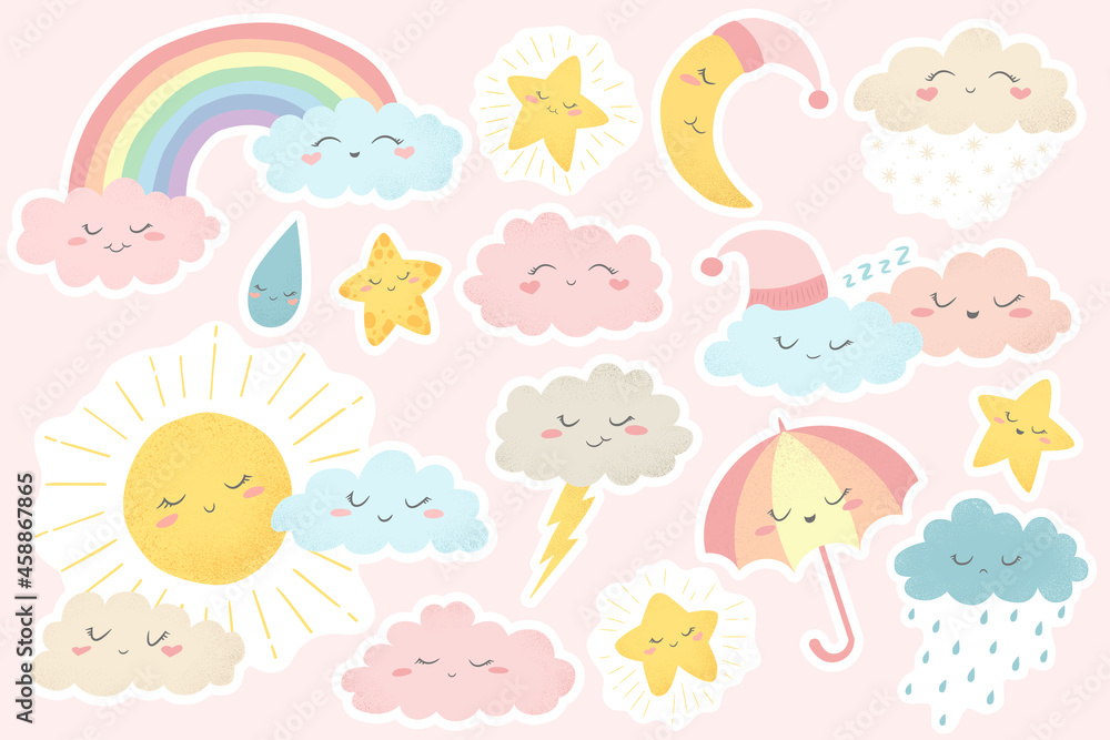 Fototapeta Vector stickers collection with hand drawn cartoon sun, moon, rainbow, umbrella, rain, snow, clouds and stars isolated on pink background