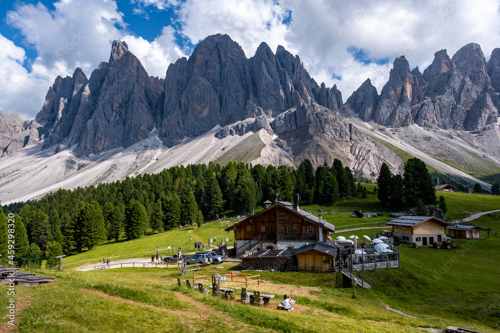 Fototapeta Geisler Alm, Dolomites Italy, hiking in the mountains of Val Di Funes in Italian Dolomites,Nature Park Geisler-Puez with Geisler Alm in South Tyrol
