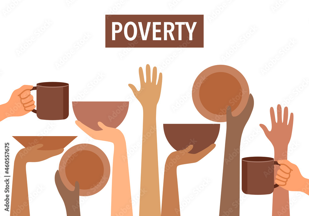 Fototapeta Poverty hunger holding bowl, plate, dish and cup for food in flat design on white background