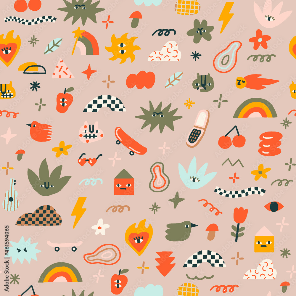 Fototapeta Funny and joyful contemporary pattern with animals, trippy characters and raw shape objects