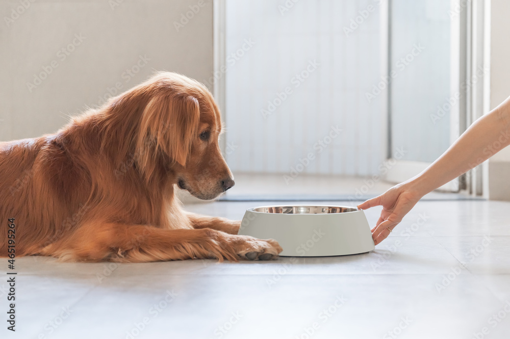 Fototapeta Golden Retriever lying on the floor and eating