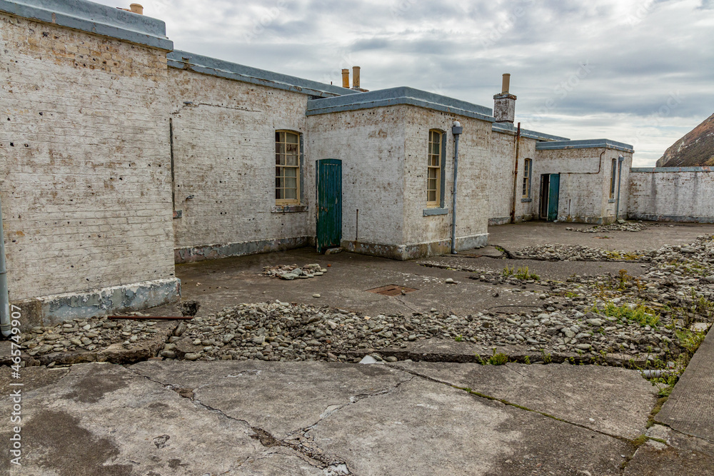 Fototapeta Outside views of older derelict coastguard lighthouse buildings and old rail tra