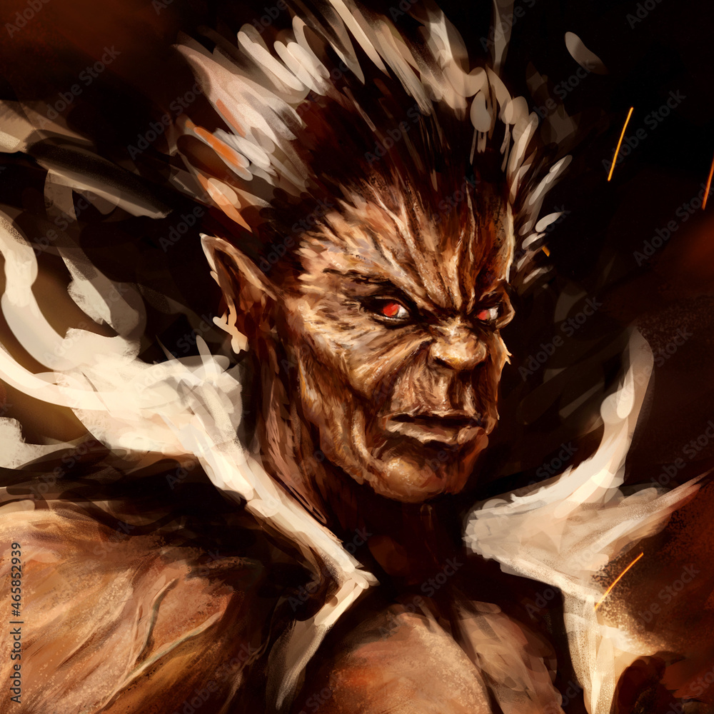 Fototapeta A demonic warrior with a bare torso and gray hair and a burning hand