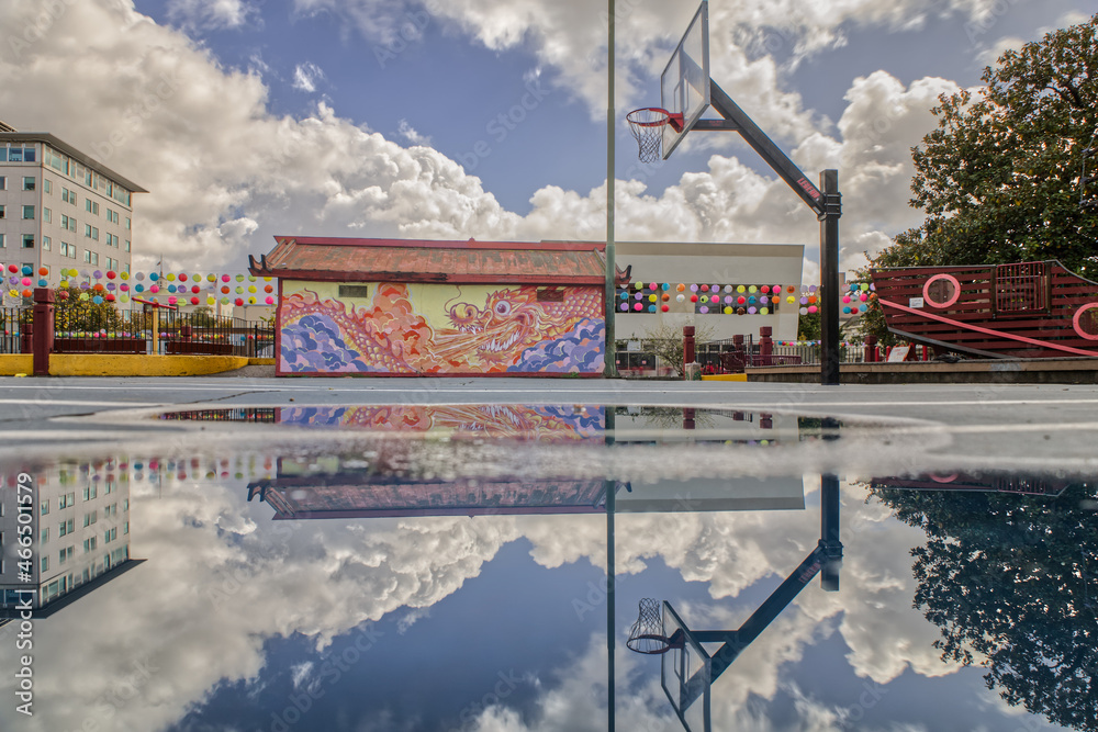 Fototapeta Oakland Chinatown Playground Reflected through Puddle