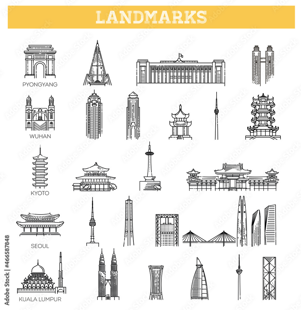 Fototapeta Simple linear Vector icon set representing global tourist asian landmarks and tr