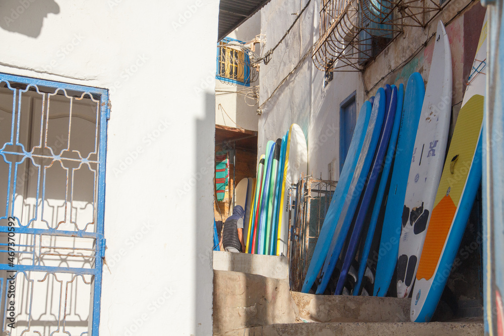 Fototapeta surfing boards in a village alley