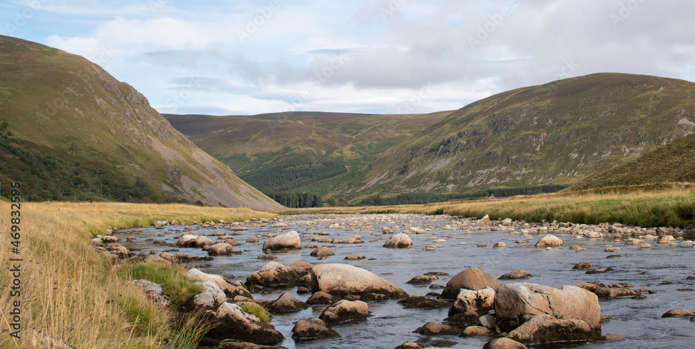 Fototapeta A rock-strewn river flows through the Findhorn Valley, Scottish Highlands, with