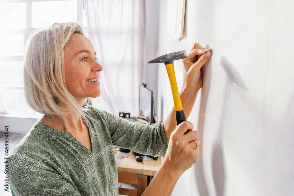 Fototapeta Happy smiling middle aged woman hammering nail to wall