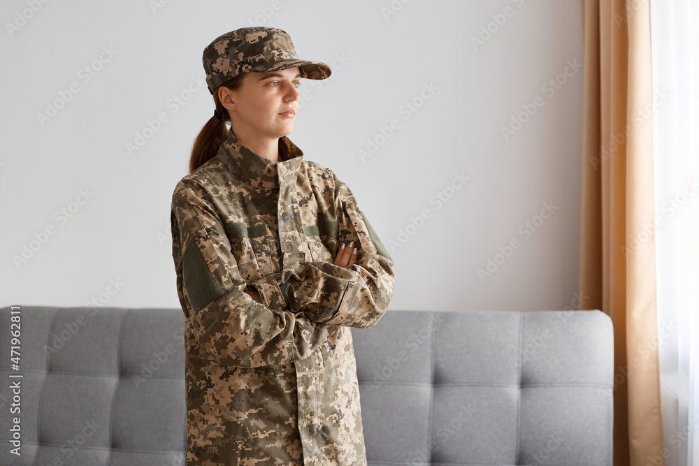 Fototapeta Portrait of serious female airman standing indoor against gray sofa and window indoor, keeping hands folded and looking away, returning home after military serve
