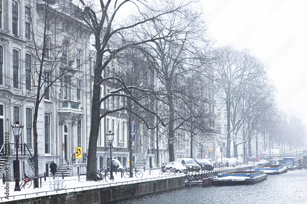Fototapeta Snow covered streets with cold weather in Amsterdam, Netherlands